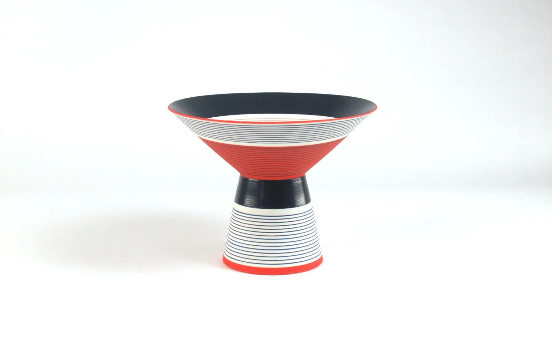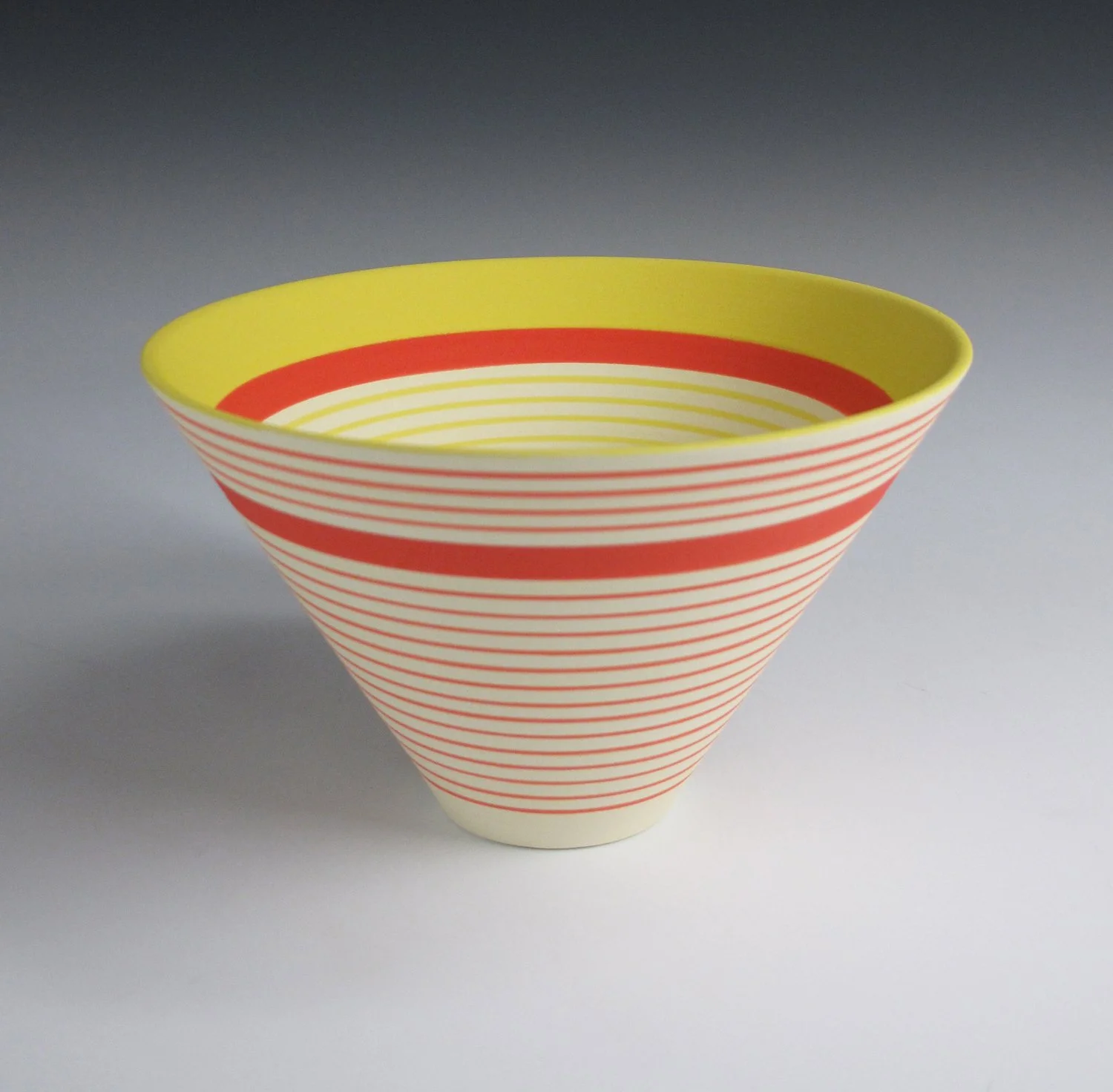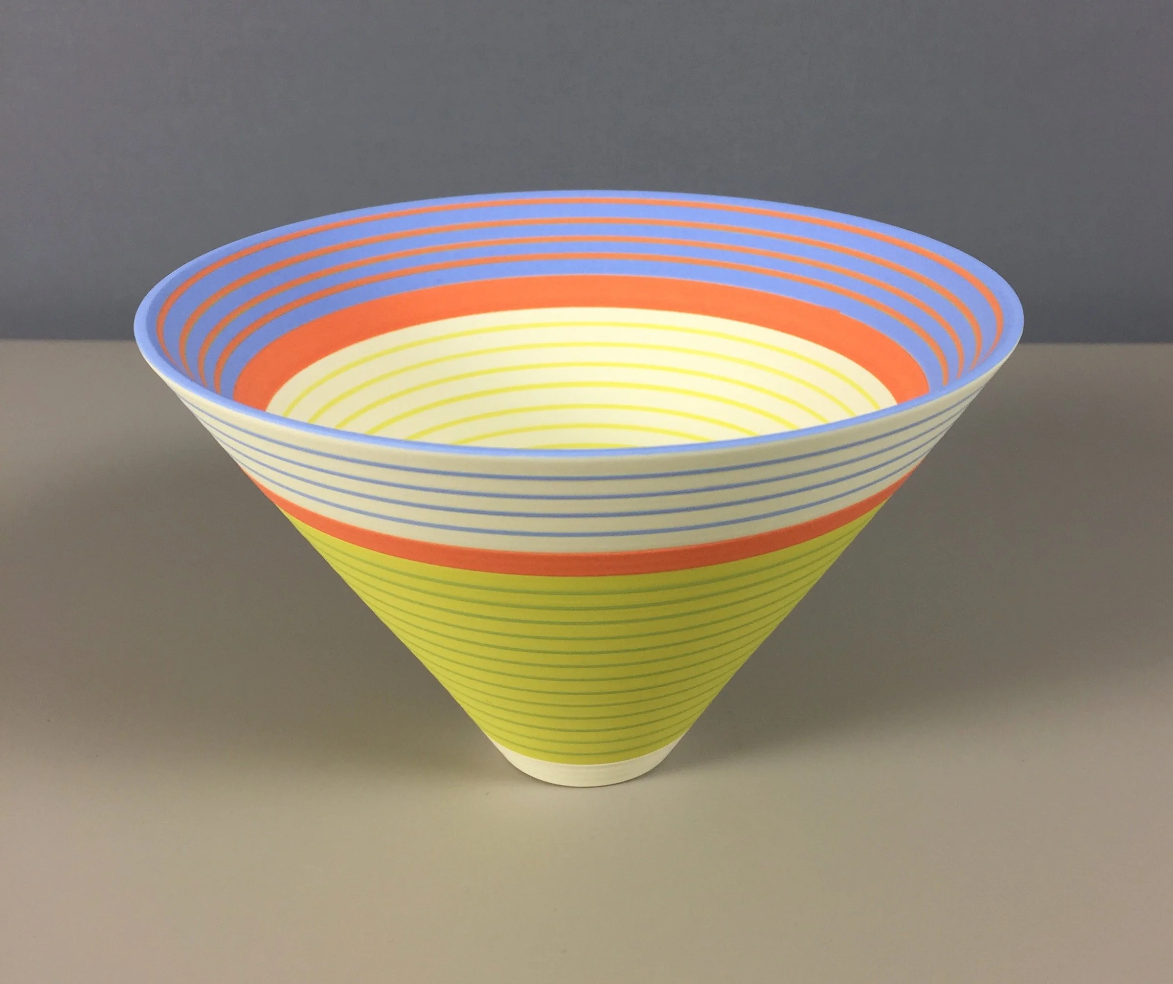 Growing up surrounded by the arable landscapes of Nottinghamshire, the division of space through colour has always fascinated me. Through farming vast spaces are divided into shapes, each one uniquely defined by its colour, texture, line and form. These colourful shapes lead the spectator’s eye around the landscape in a particular way. The arrangements of colour in my Arable Landscape collection similarly determine the way the eye moves around the form.