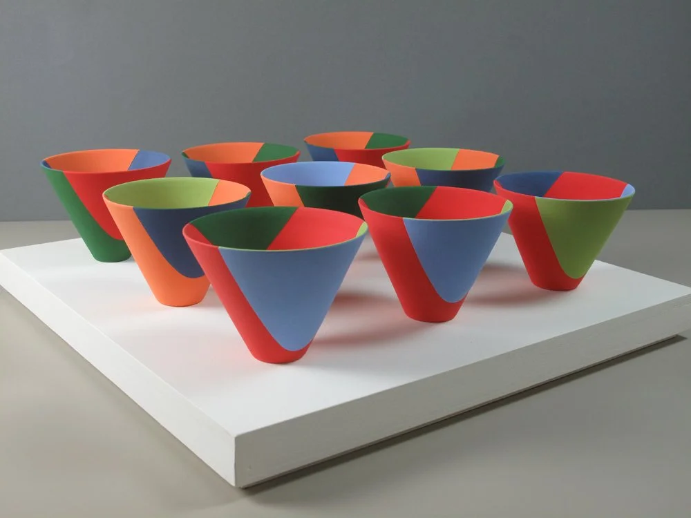 Colourblocks is a 16-part wall installation. Individual forms are divided into sections using a laser level and each area is painted with underglaze colour. This vertical demarcation is more incongruous with the shape than my horizontally-banded forms and affects the perception of form in a different way. Linear connections can be made between each form and the appearance of the artwork changes significantly as the viewer changes position, asserting the viewer as the key protagonist in the appearance of the piece.