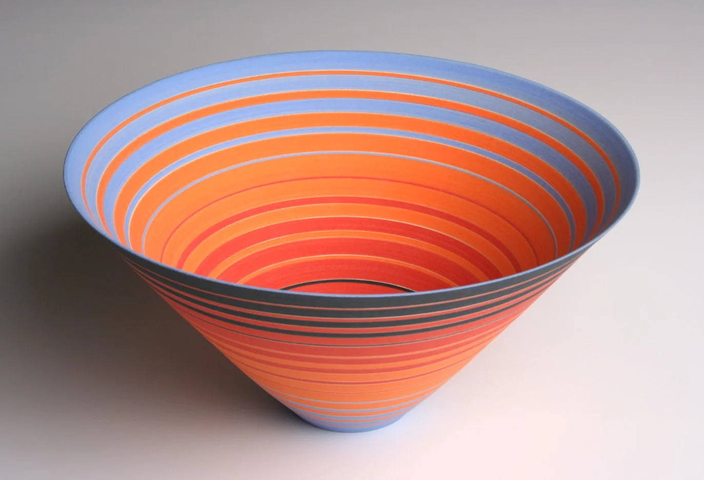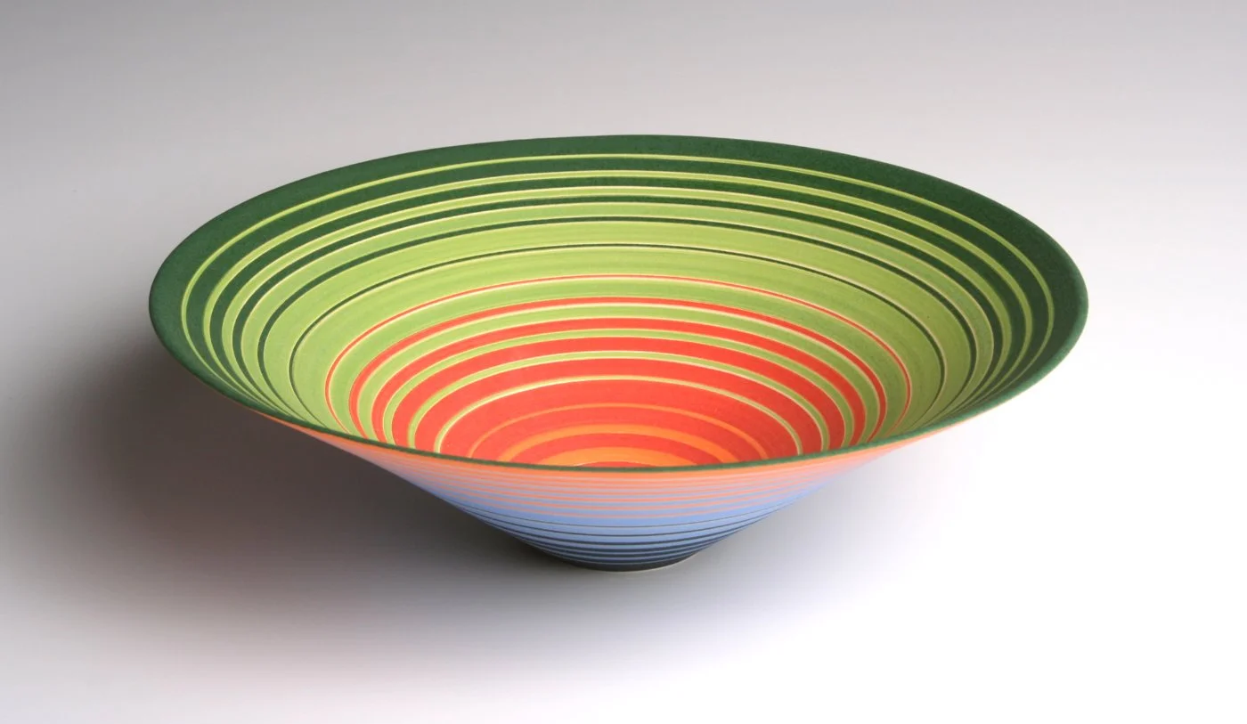 This is the second body of work which began during my Masters program in ceramics in 2004. The source material is once again the arable landscapes of North Nottinghamshire, but on this occasion, the shallow, undulating and rolling nature of the hills. The interlocking, increasing and decreasing band widths refer to this gentle movement, whilst the complimentary colours of blue and orange, and green and red, on either surface slowly oscillate to enhance the rise and fall.