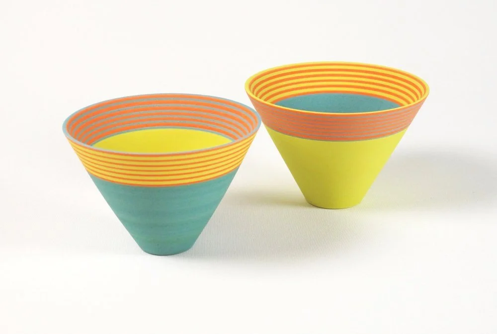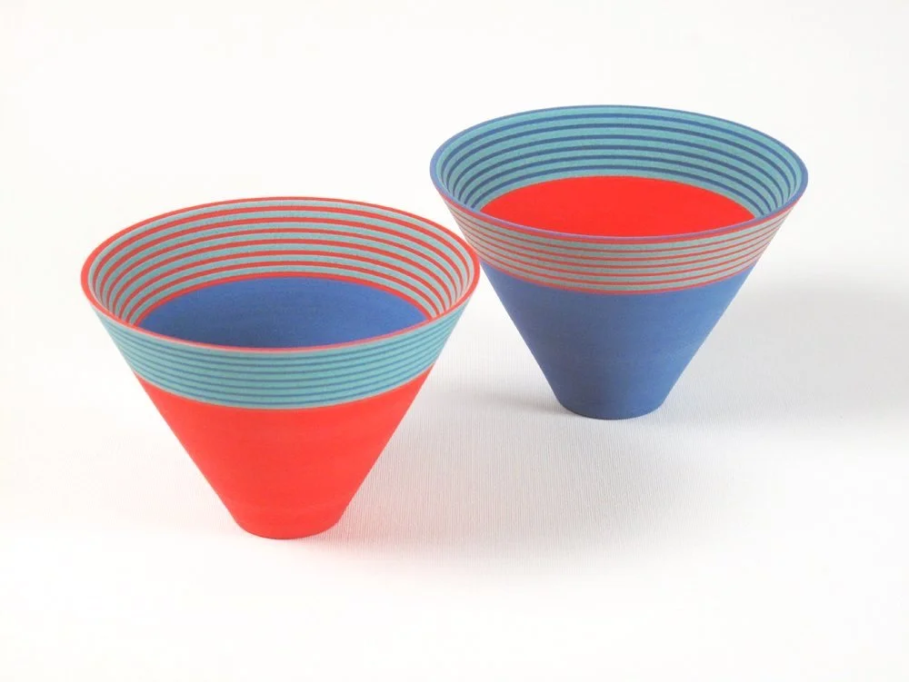 For this I created ‘Saturn Bowl’. The 5 colours in Saturn were derived from an image of Saturn seen through an infrared lens, showing colours the naked eye cannot see. Different colours indicate the layers and varying densities of cloud and haze, while the vibration of the narrow lines refer to the constantly moving small particles which make up the planets rings.