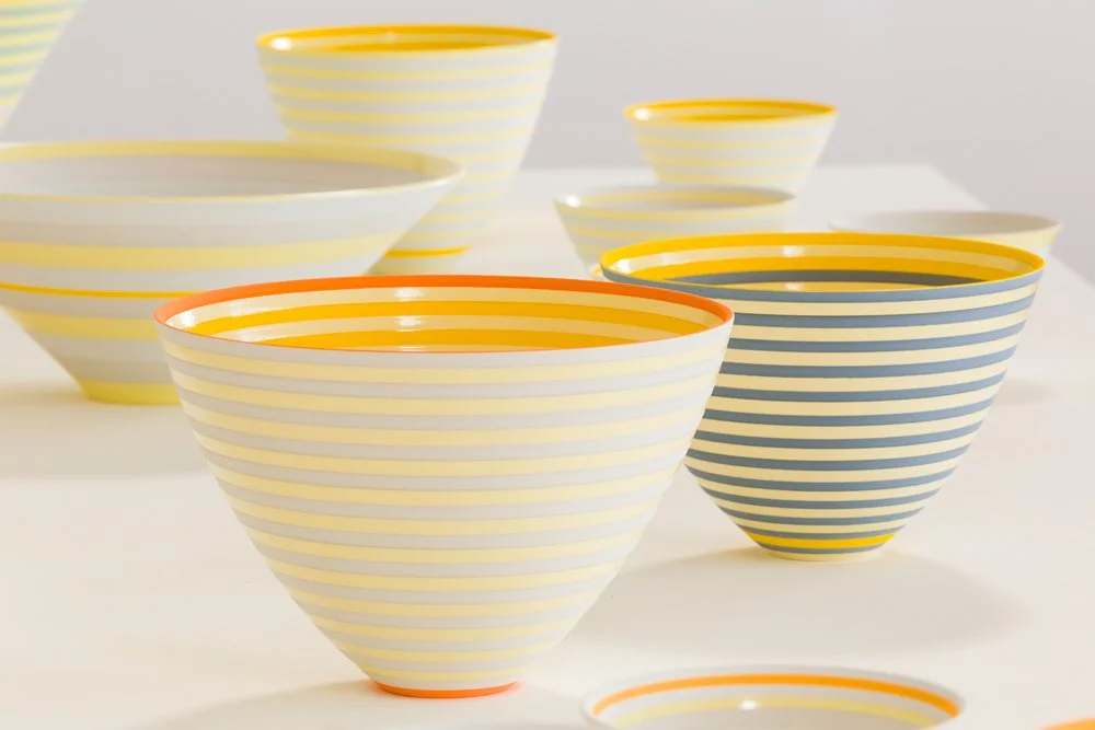 This body of work is the result of a period of development funded by the Arts Council of Wales, and was exhibited at Petronilla Silver Gallery in Cape Cornwall. Using the seascapes of St. Ives as my source material the work reflects the unique colours and light of the area. High gloss bands against matt bands refer to thin layers of water left by the receding tide across an otherwise damp matt beach. The potential for the appearance of illusion across the bowl form when gloss and matt bands are juxtaposed is great. For example, one bowl may appear to be inside another or steps appear on smooth walls.